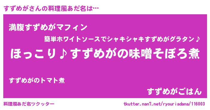 | 意味不明あだ名 | 『ペロリンすずめが』『永久保存すずめが』 |