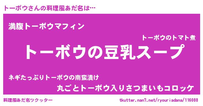 | 胡散臭い通販商品みたいなあだ名 | 『信頼と実績のサプリメント…その名も「トーボウ」』 |