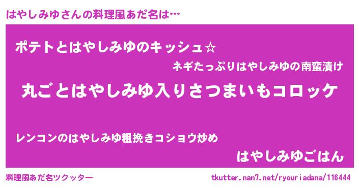 | 意味不明あだ名 | 『住所不定無職はやしみゆ(7歳)』 |