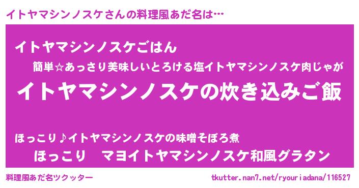 | 男性向けラノベタイトル風あだ名 | 『うちのイトヤマシンノスケが世界を掌握している!』 |