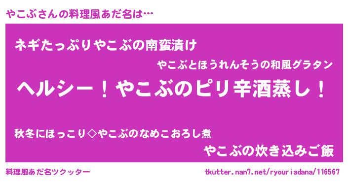 | 男性向けラノベタイトル風あだ名 | 『Re:やこぶから始める異世界生活』 |