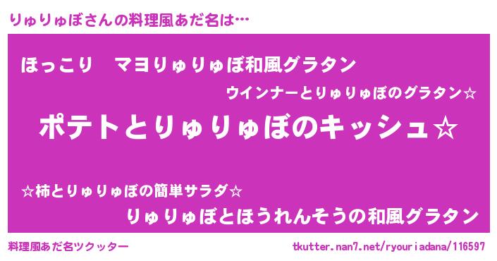 | 女子向けラノベタイトル風あだ名 | 『りゅりゅぼの卵を拾いまして』 |