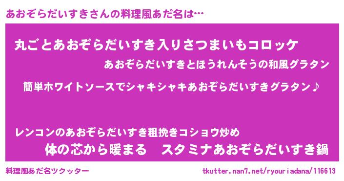 | 男性向けラノベタイトル風あだ名 | 『あおぞらだいすきの嫁は女の子じゃないと思った?』 |