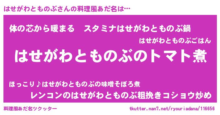 | 男性向けラノベタイトル風あだ名 | 『おまえをオタクにしてやるから、俺をはせがわとものぶにしてくれ! 』 |