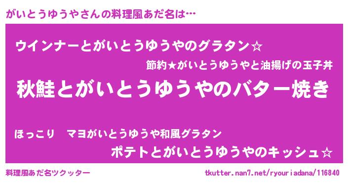 | ヘコむあだ名 | 『がいとうゆうや(苦笑)』『なまこ酢』 |