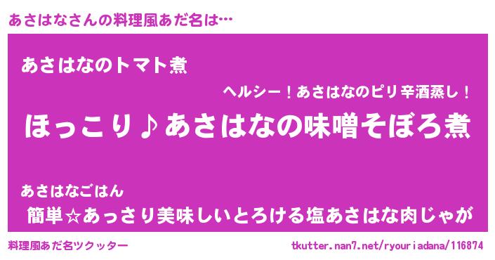 | 男性向けラノベタイトル風あだ名 | 『あさはなの憂鬱』『アサハナスレイヤー』 |
