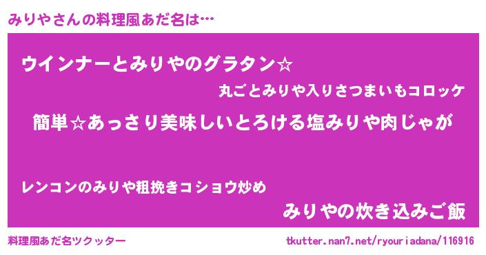 | 意味不明あだ名 | 『永久保存みりや』『みりやフォーエバー』 |