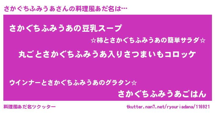 | 男性向けラノベタイトル風あだ名 | 『この素晴らしい世界にさかぐちふみうあを!』 |