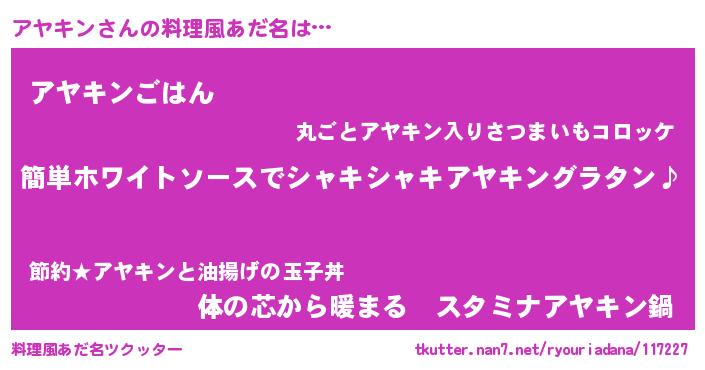 | 男性向けラノベタイトル風あだ名 | 『アヤキンの嫁は女の子じゃないと思った?』 |