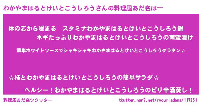 | 男性向けラノベタイトル風あだ名 | 『わかやまはるとけいとこうしろうの嫁は女の子じゃないと思った?』 |