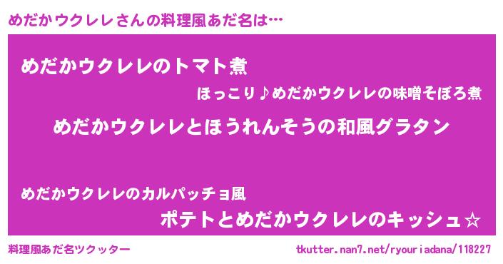 | 男性向けラノベタイトル風あだ名 | 『転生したらめだかウクレレだった件』 |