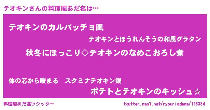 | 男性向けラノベタイトル風あだ名 | 『テオキンに滅ぼされるだけの簡単なお仕事です』 |