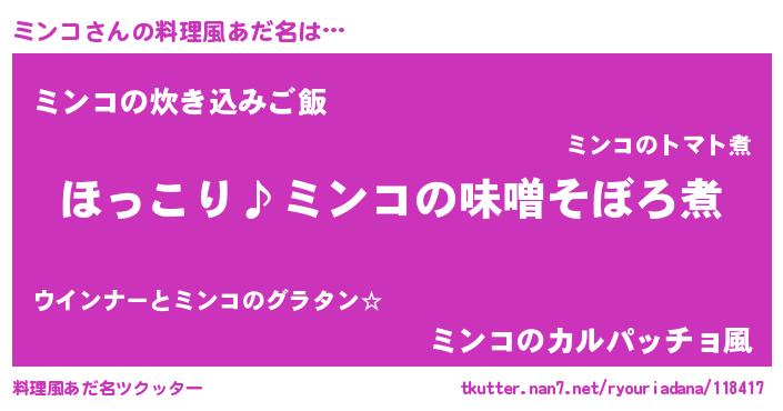 | 意味不明あだ名 | 『ペロリンミンコ』『ミンコフォーエバー』 |