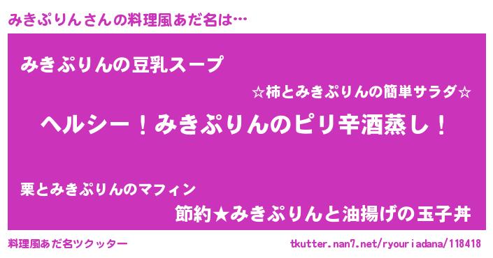 | 男性向けラノベタイトル風あだ名 | 『Re:みきぷりんから始める異世界生活』 |