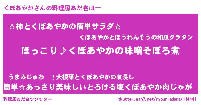 | 女子向けラノベタイトル風あだ名 | 『(仮)くぼあやかのやんごとなき事情』 |