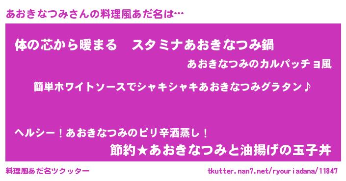 | ポケモン風あだ名 | 『ヒアオキナツミ』『アオキダネ』 |