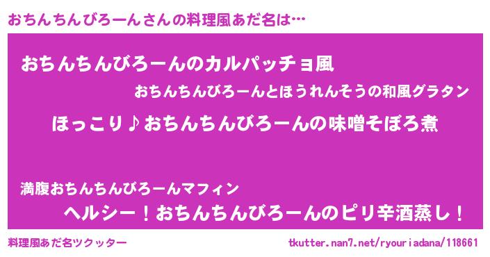 | 男性向けラノベタイトル風あだ名 | 『おちんちんびろーんの憂鬱』 |