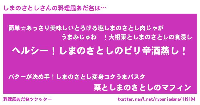 | 男性向けラノベタイトル風あだ名 | 『Re:しまのさとしから始める異世界生活』 |