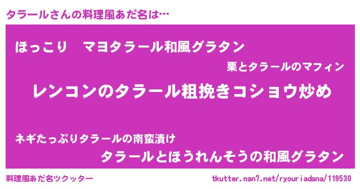 | 女子向けラノベタイトル風あだ名 | 『タラールなんてお断りですっ。』 |