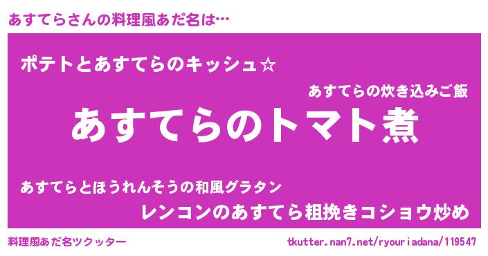 | 女子向けラノベタイトル風あだ名 | 『あすてら夫妻のなれそめ』 |