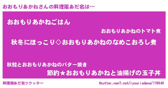 | 胡散臭い通販商品みたいなあだ名 | 『億万長者になれるブレスレット…その名も「おおもりあかね」』 |