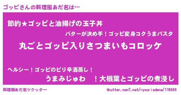 | 男性向けラノベタイトル風あだ名 | 『魔弾の王とゴッピ』『ゴッピの憂鬱』 |