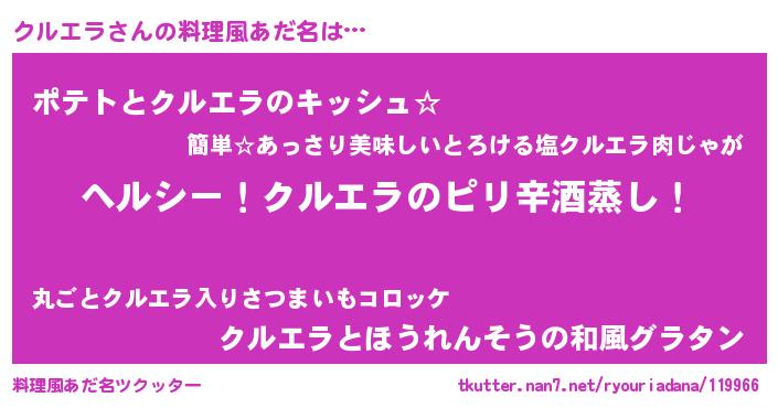 | ヒーロー風カッコイイあだ名 | 『究極戦士クルエラ』『魔戒騎士クル』 |