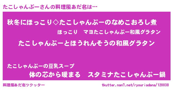 | 女子向けラノベタイトル風あだ名 | 『たこしゃんぷーの玉の輿計画!』 |