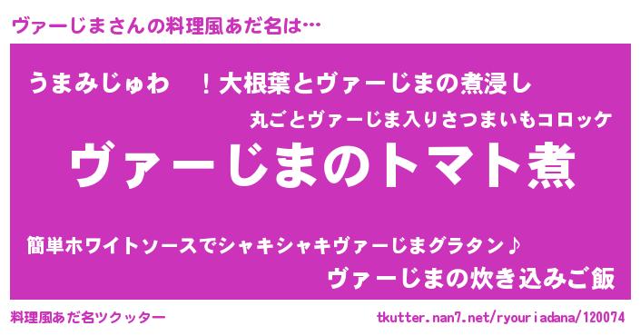 | 男性向けラノベタイトル風あだ名 | 『おまえをオタクにしてやるから、俺をヴァーじまにしてくれ! 』 |