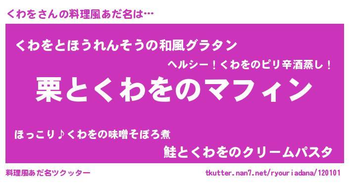 | 男性向けラノベタイトル風あだ名 | 『はたらくくわをさま!』『くわをの憂鬱』 |