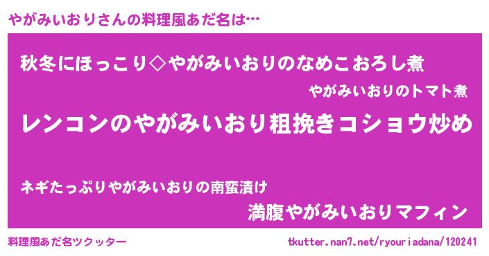 | ヘコむあだ名 | 『やがみいおり(爆)』『やがにゅー』 |