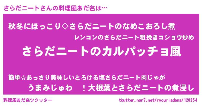 | 女子向けラノベタイトル風あだ名 | 『さらだニートが死なない童話 林檎のさらだニートの診療簿』 |