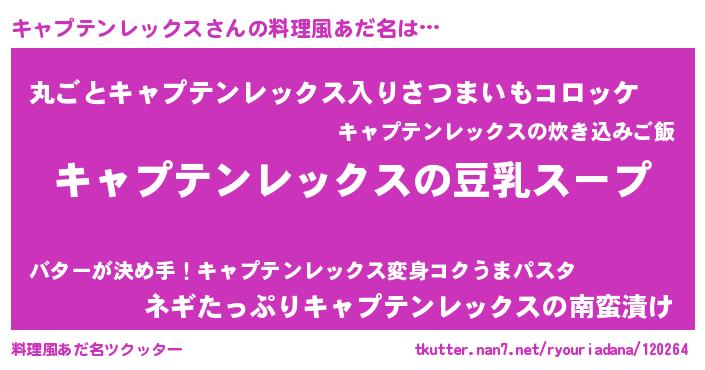 | 胡散臭い通販商品みたいなあだ名 | 『信頼と実績のサプリメント…その名も「キャプテンレックス」』 |