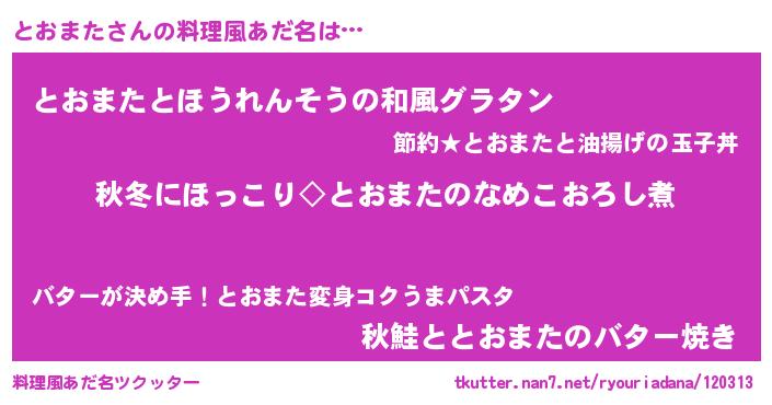 | 胡散臭い通販商品みたいなあだ名 | 『前代未聞の健康食品…その名も「とおまた」』 |