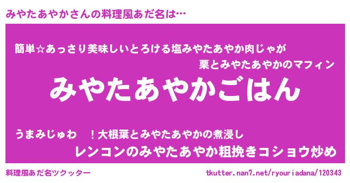 | ヘコむあだ名 | 『みやたあやか(笑)』『酢こんぶ』 |