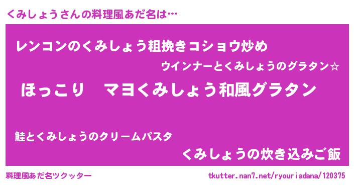 | ヒーロー風カッコイイあだ名 | 『仮面クミダー』『超時空戦士クミショウ』 |