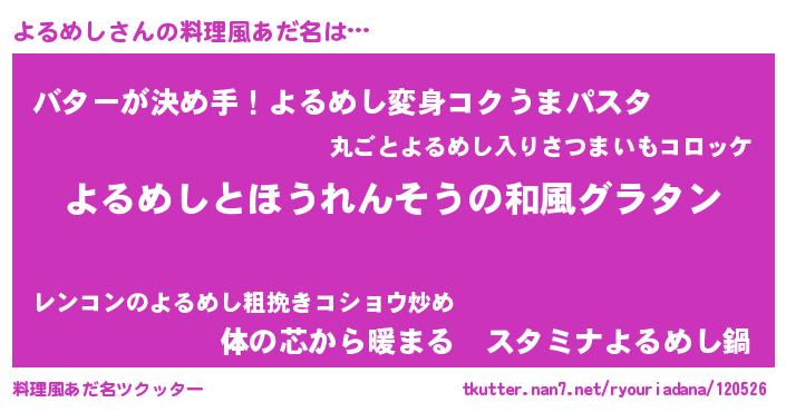 | 女子向けラノベタイトル風あだ名 | 『よるめしの玉の輿計画!』 |