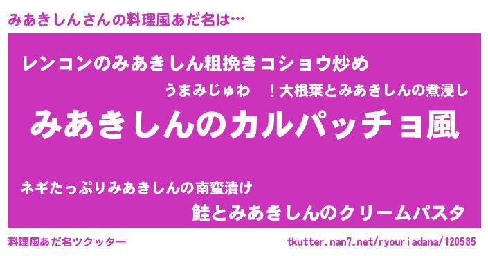 | 女子向けラノベタイトル風あだ名 | 『みあきしんが死なない童話 林檎のみあきしんの診療簿』 |