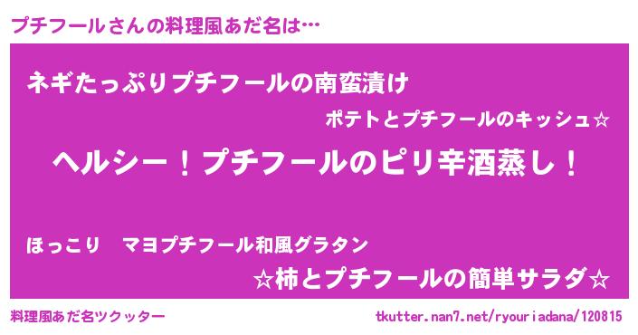 | 男性向けラノベタイトル風あだ名 | 『Re:プチフールから始める異世界生活』 |