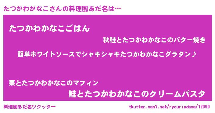 | 男性向けラノベタイトル風あだ名 | 『たつかわかなこの嫁は女の子じゃないと思った?』 |