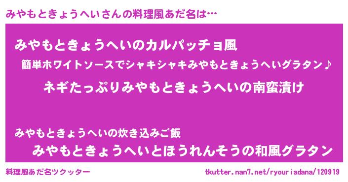 | 胡散臭い通販商品みたいなあだ名 | 『億万長者になれるブレスレット…その名も「みやもときょうへい」』 |