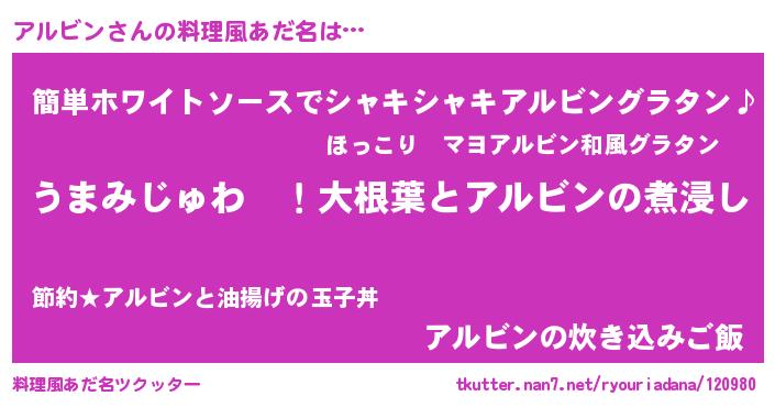 | ポケモン風あだ名 | 『アルビダネ』『ヒアルビン』 |