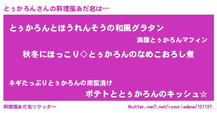 | 男性向けラノベタイトル風あだ名 | 『とぅかろんに滅ぼされるだけの簡単なお仕事です』 |