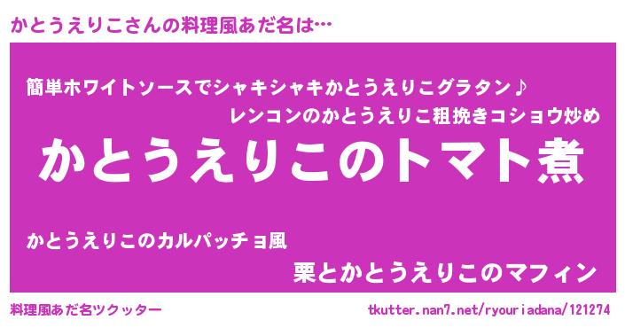 | 男性向けラノベタイトル風あだ名 | 『おまえをオタクにしてやるから、俺をかとうえりこにしてくれ! 』 |