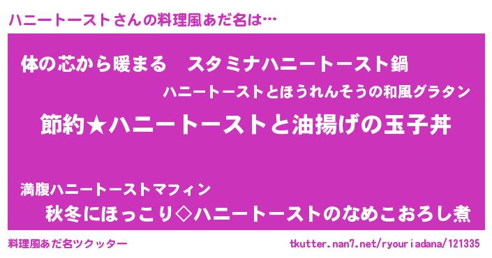 | 女子向けラノベタイトル風あだ名 | 『ハニートースト姫と円卓の騎士』 |