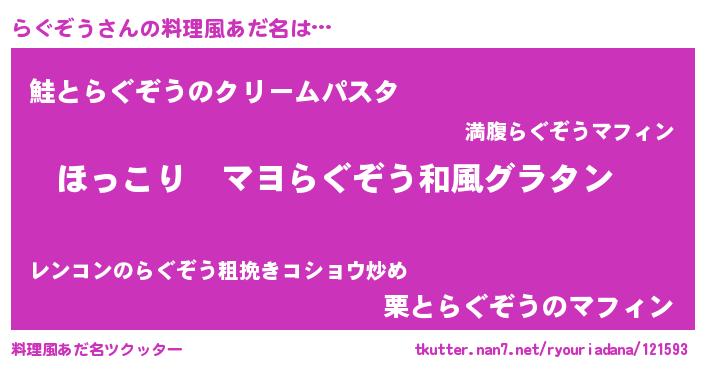 | 男性向けラノベタイトル風あだ名 | 『この素晴らしい世界にらぐぞうを!』 |