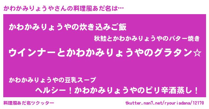 | 男性向けラノベタイトル風あだ名 | 『やはりかわかみりょうやの青春ラブコメはまちがっている 』 |