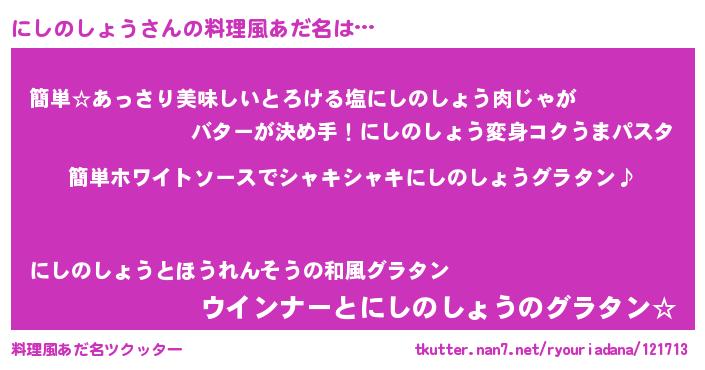| 男性向けラノベタイトル風あだ名 | 『にしのしょうの嫁は女の子じゃないと思った?』 |
