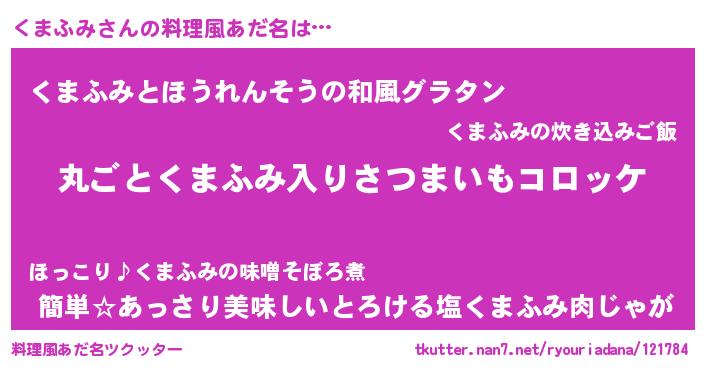 | 男性向けラノベタイトル風あだ名 | 『魔弾の王とくまふみ』『くまふみの憂鬱』 |