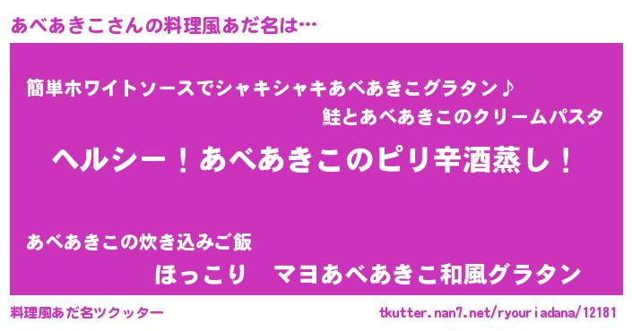 | 男性向けラノベタイトル風あだ名 | 『Re:あべあきこから始める異世界生活』 |